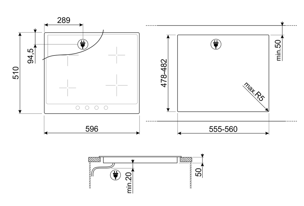 Расположение панели управления варочной поверхностью относительно конфорок. Если панель расположена сбоку, она будет справа.