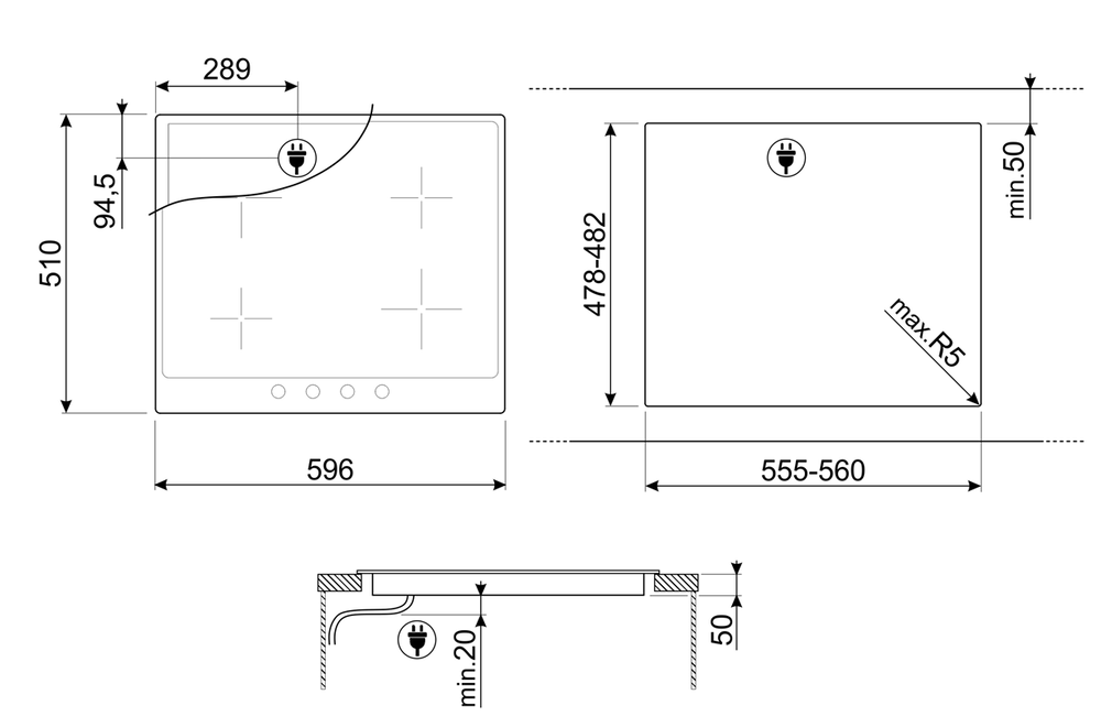 Расположение панели управления варочной поверхностью относительно конфорок. Если панель расположена сбоку, она будет справа.