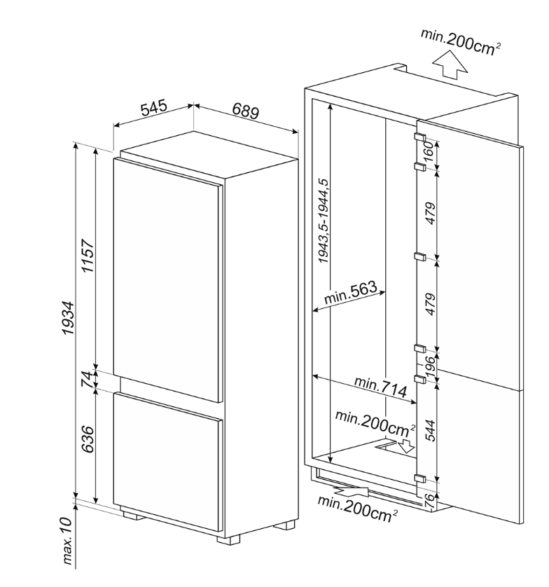 холодильник-морозильник встраиваемый, 400 л, класс энергопотребления E, ручная система размораживания, 69х55х194 см