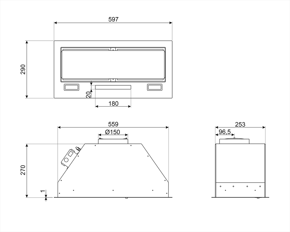 вытяжка встраиваемая в подвесной шкаф, 60 см, 660 м3/ч, черный матовый