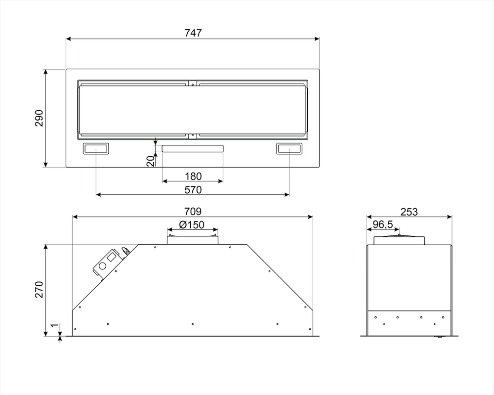 вытяжка встраиваемая в подвесной шкаф, 75 см, 681 м3/ч, черный матовый