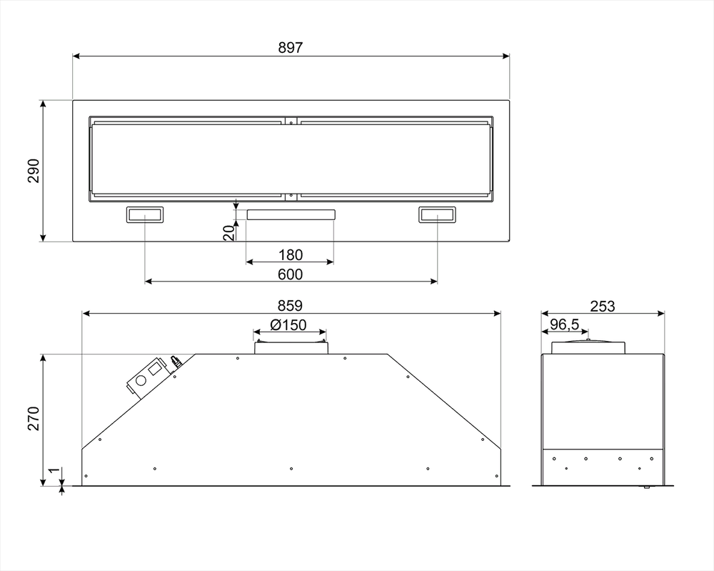 вытяжка встраиваемая в подвесной шкаф, 90 см, 697 м3/ч, черный матовый