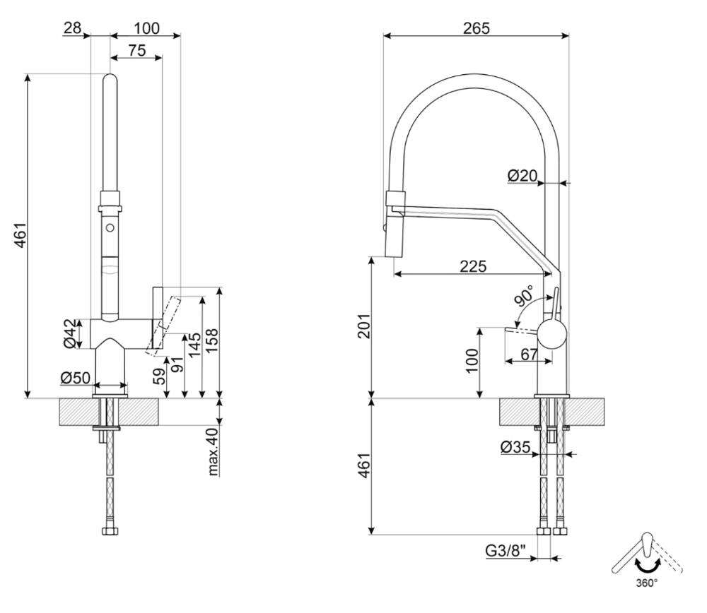 смеситель для кухни, нержавеющая сталь, высокий поворотный выдвижной излив, хром + черная сталь