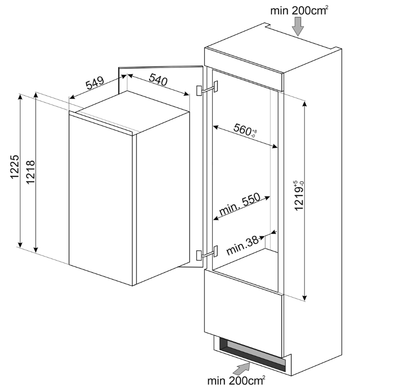 холодильник однокамерный встраиваемый, 188 л, класс энергопотребления E, капельная система размораживания, 54,8x54,9x121,8 см