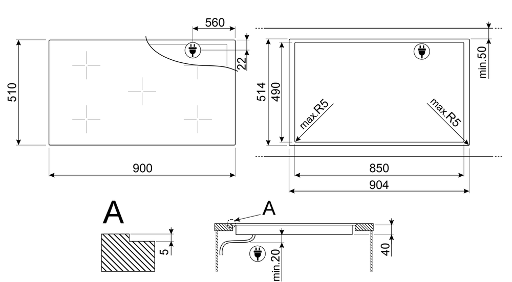 Характер огранки фаски на внешней стороне варочной панели. Металлические рамки предотвращают забивание монтажных швов крошками и пылью.
