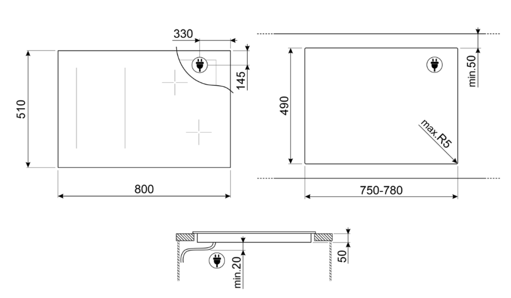 Характер огранки фаски на внешней стороне варочной панели. Металлические рамки предотвращают забивание монтажных швов крошками и пылью.