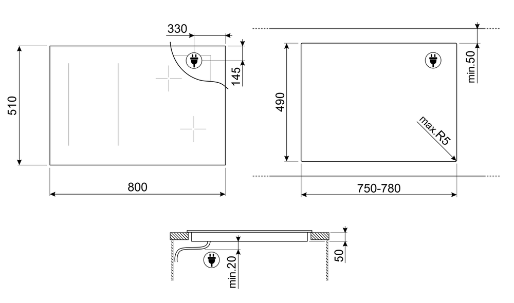 Характер огранки фаски на внешней стороне варочной панели. Металлические рамки предотвращают забивание монтажных швов крошками и пылью.