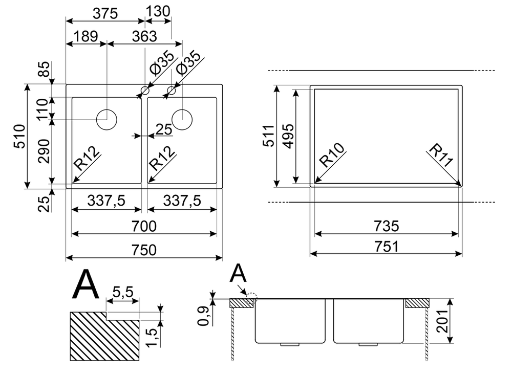мойка, нержавеющая сталь, 750х510 мм, нержавеющая сталь матовая