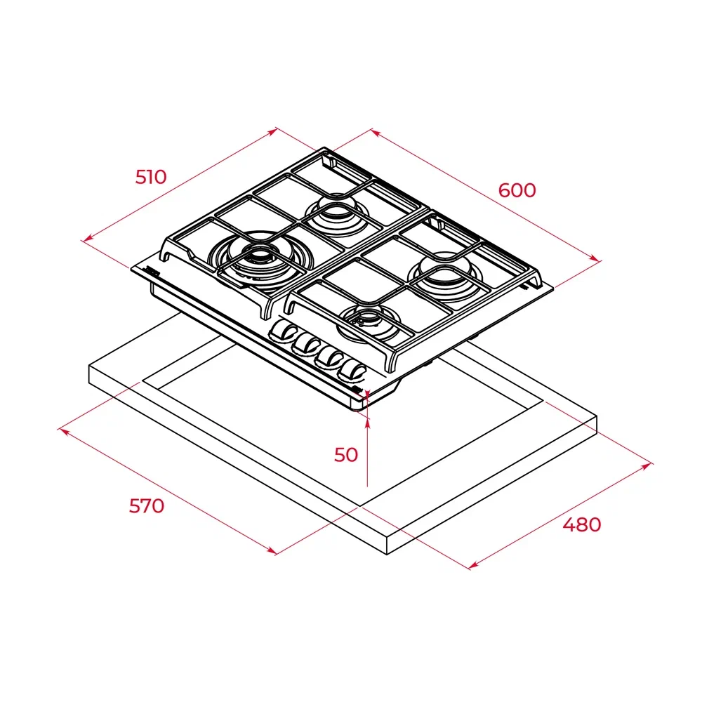 поверхность газовая, 60 см, газ на стекле, 4 конфорки, решетки чугунные, черный