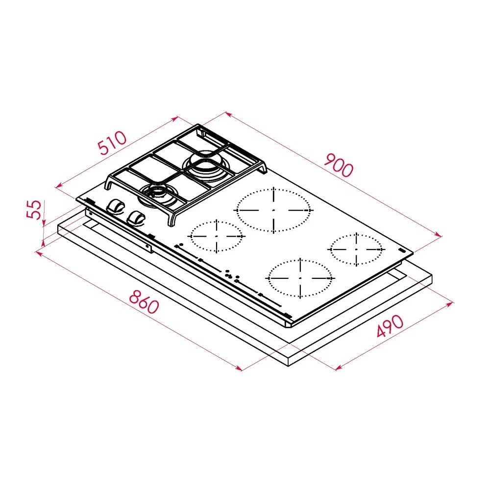 поверхность комбинированная, 90 см, 6 конфорок (4 - индукционных, 2 - газовых), черный, передний край скошенный