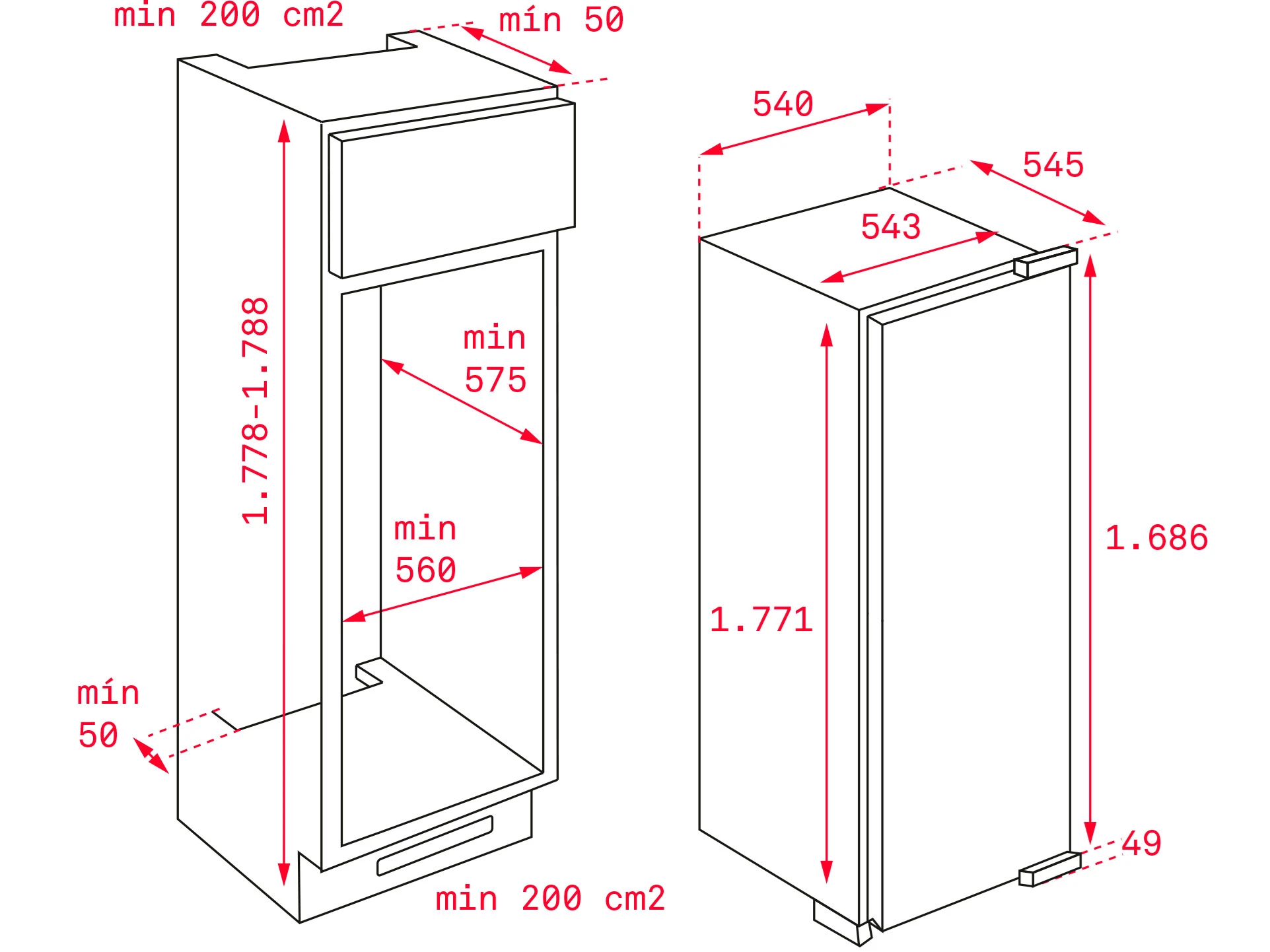 холодильник однокамерный встраиваемый, 310 л, класс энергопотребления А+, капельная система размораживания, 54.3x54.5x177.1 см