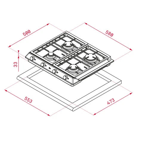 поверхность газовая, 60 см, газ на металле, 4 конфорки, решетки чугунные, нержавеющая сталь