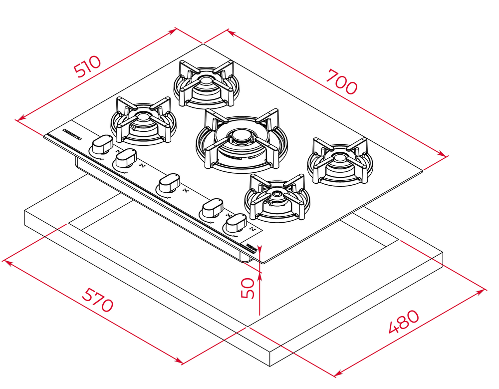 поверхность газовая, 70 см, газ на стекле, 5 конфорок, решетки чугунные, черный матовый