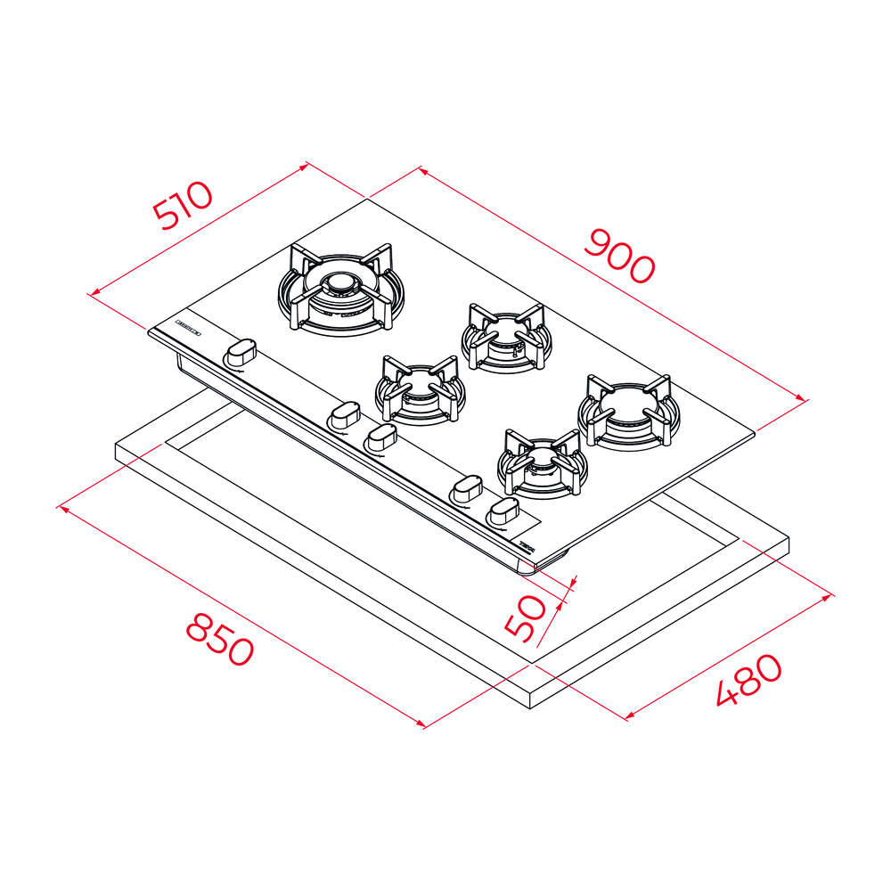 поверхность газовая, 90 см, газ на стекле, 5 конфорок, решетки чугунные, черный