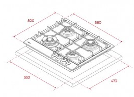 поверхность газовая, 58 см, газ на металле, 4 конфорки, решетки чугунные, антрацит