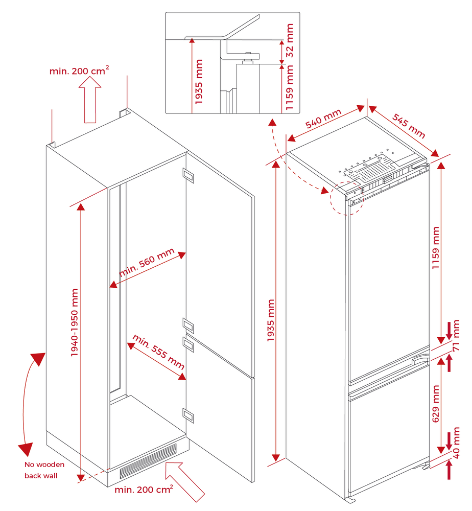 холодильник-морозильник встраиваемый, 284 л, класс энергопотребления А++, NoFrost, 54х54,5х193.5 см