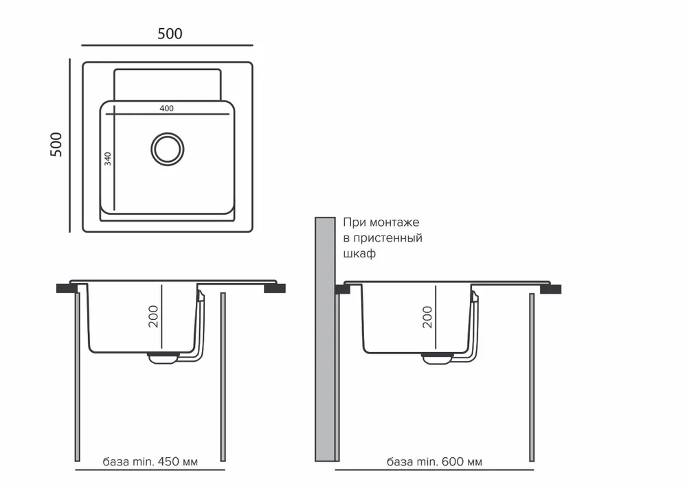 мойка, гранит/нержавеющая сталь, 500х500 мм, уголь