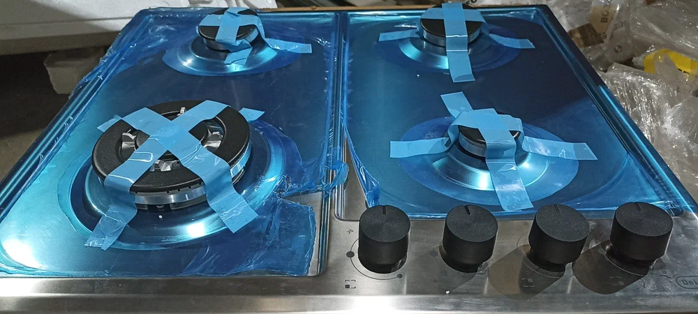 ДЕФЕКТ - вмятина на варочной поверхности в дальнем левом углу. Поверхность газовая, 60 см, газ на металле, 4 конфорки, решетки чугунные, нержавеющая сталь