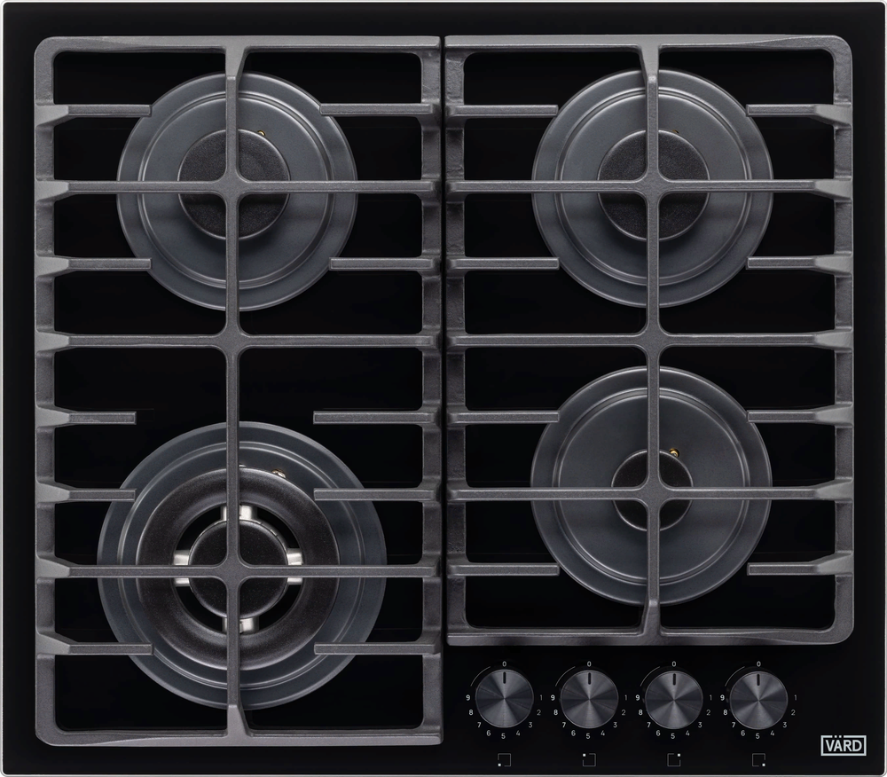 поверхность газовая независимая, 60 см, газ на стекле, 4 конфорки, решетки чугунные, черный