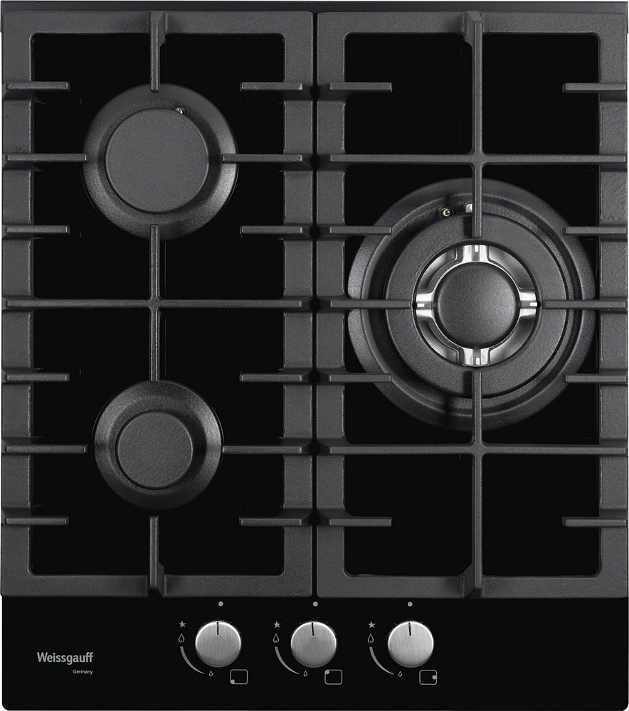 поверхность газовая независимая, 45 см, газ на стекле, 3 конфорки, решетки чугунные, черный