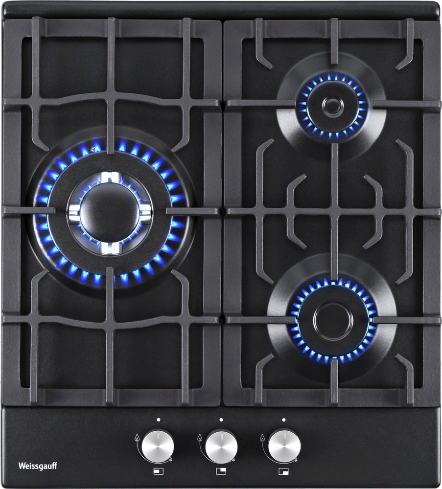 поверхность газовая независимая, 45 см, газ на эмали, 3 конфорки, решетки чугунные, черный