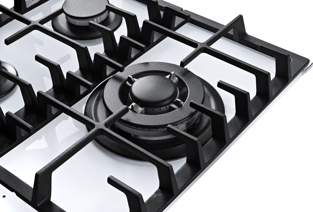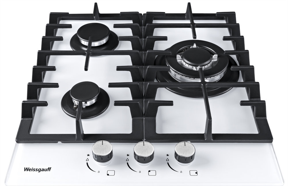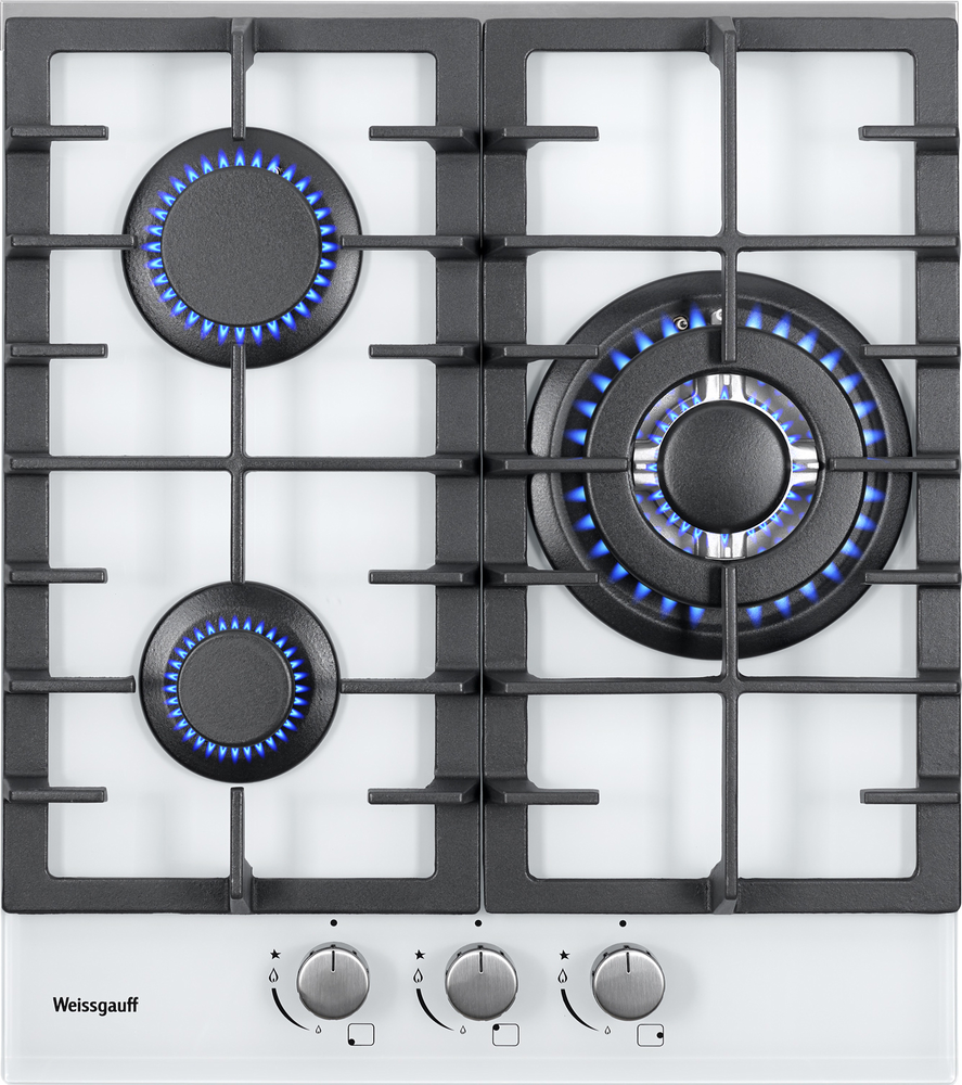 поверхность газовая независимая, 45 см, газ на стекле, 3 конфорки, решетки чугунные, белый
