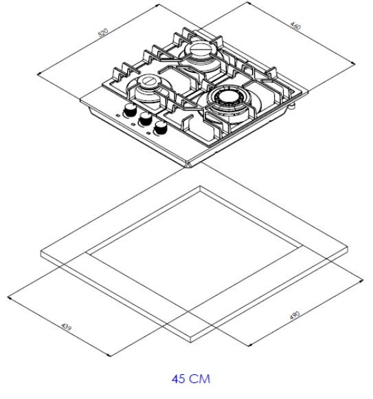 поверхность газовая, 45 см, газ на металле, 4 конфорки, решетки чугунные, нержавеющая сталь