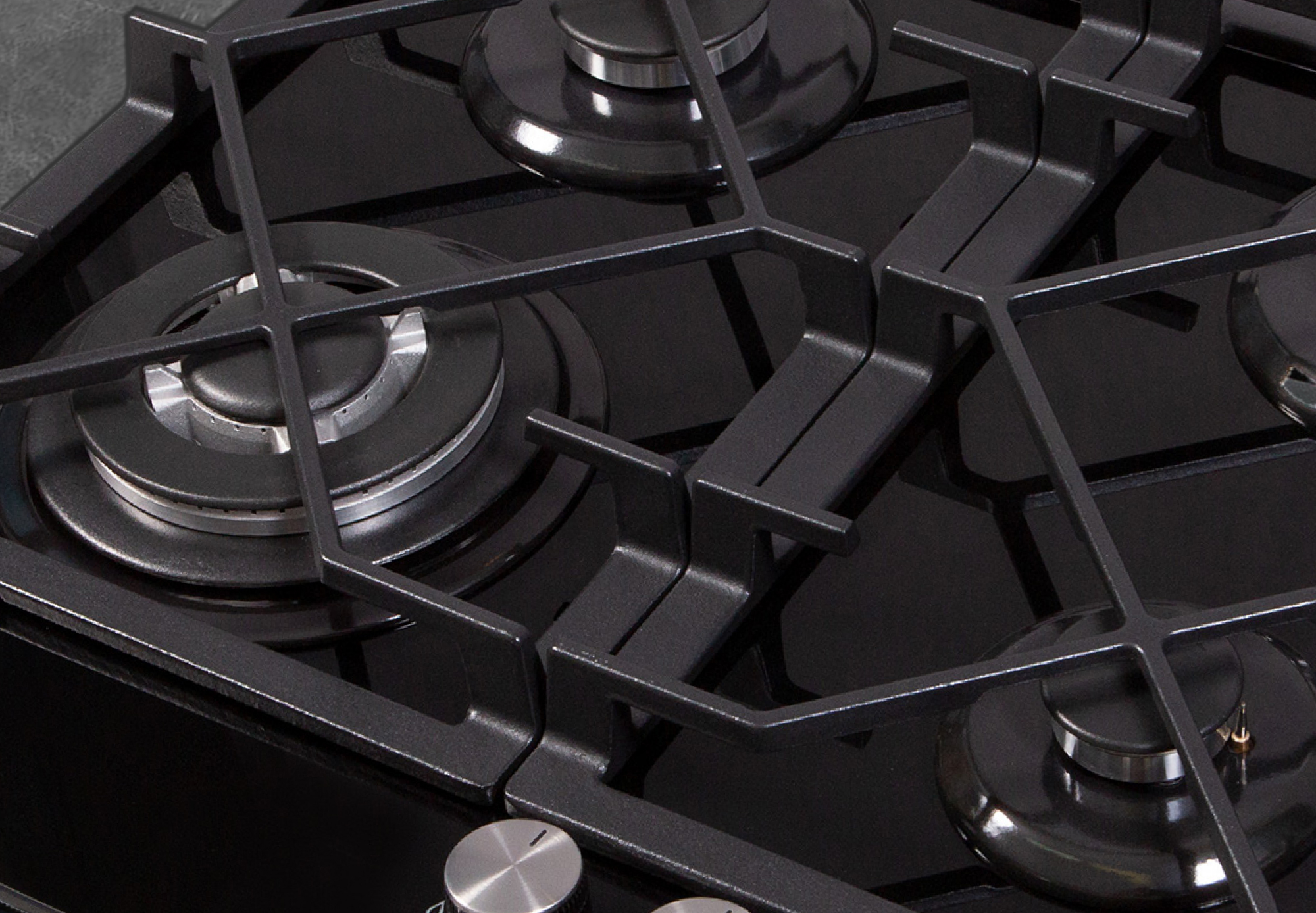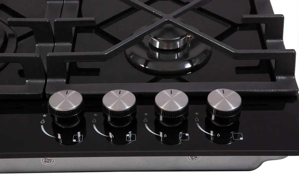 поверхность газовая, 60 см, газ на стекле, 4 конфорки, решетки чугунные, черный