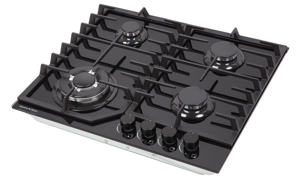 поверхность газовая, 60 см, газ на стекле, 4 конфорки, решетки чугунные, черный