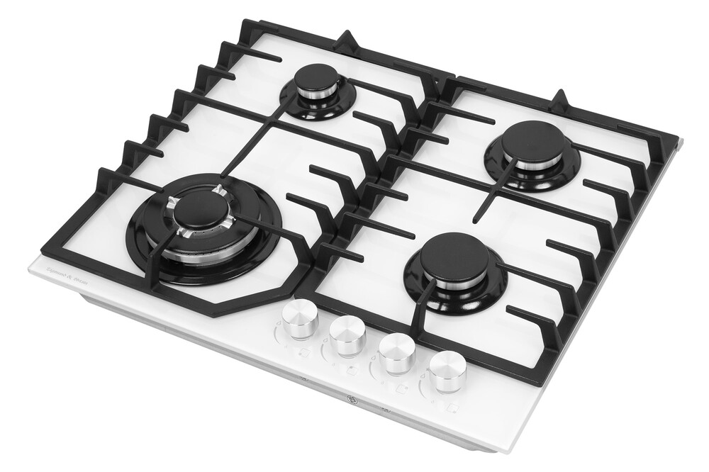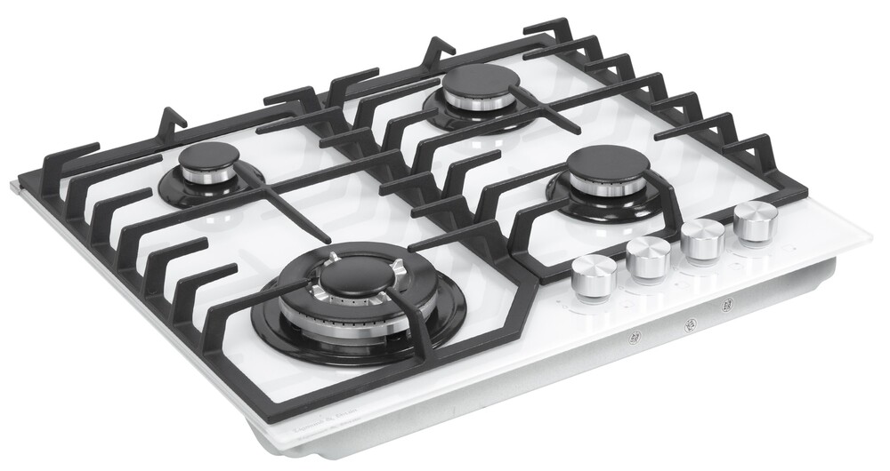 поверхность газовая, 60 см, газ на стекле, 4 конфорки, решетки чугунные, белый