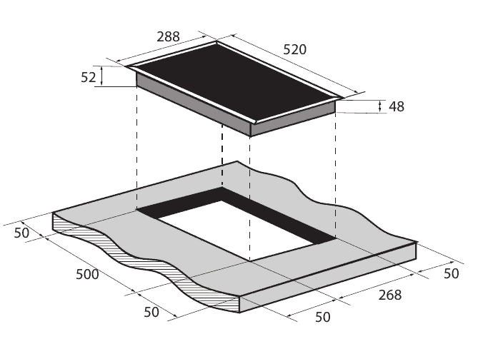 Характер огранки фаски на внешней стороне варочной панели. Металлические рамки предотвращают забивание монтажных швов крошками и пылью.