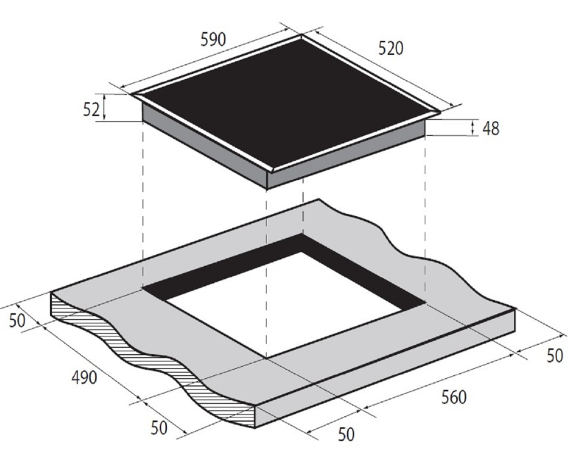 Характер огранки фаски на внешней стороне варочной панели. Металлические рамки предотвращают забивание монтажных швов крошками и пылью.