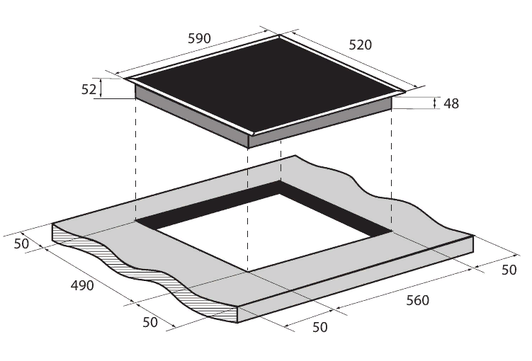 Характер огранки фаски на внешней стороне варочной панели. Металлические рамки предотвращают забивание монтажных швов крошками и пылью.