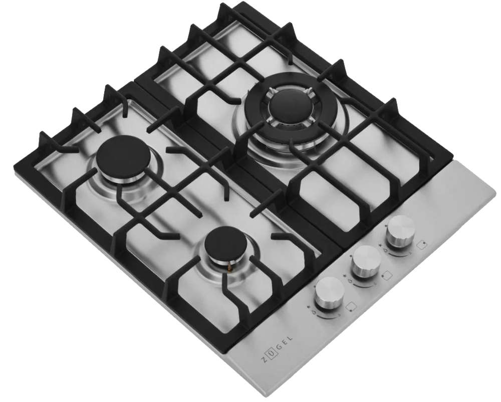 поверхность газовая, 45 см, газ на металле, 3 конфорки, решетки чугунные, нержавеющая сталь