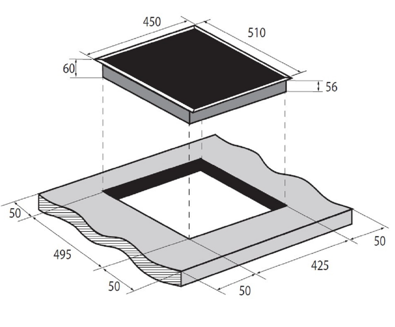 Характер огранки фаски на внешней стороне варочной панели. Металлические рамки предотвращают забивание монтажных швов крошками и пылью.