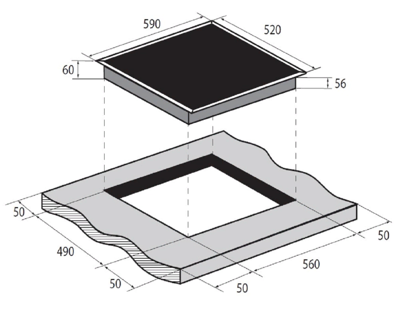 Характер огранки фаски на внешней стороне варочной панели. Металлические рамки предотвращают забивание монтажных швов крошками и пылью.