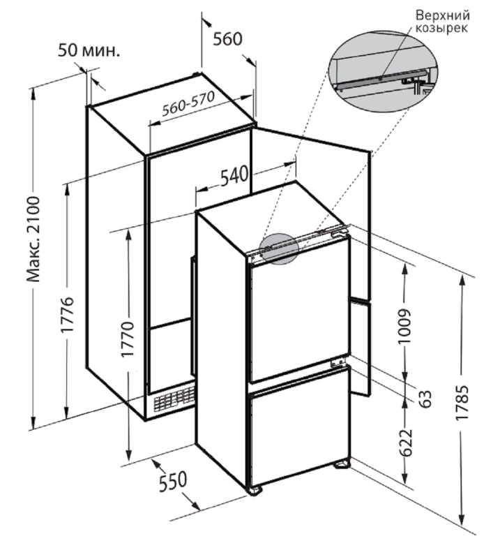 Морозильная камера может быть расположена сверху, снизу от основной камеры, Side-by-Side. Также она может отсутствовать вовсе.