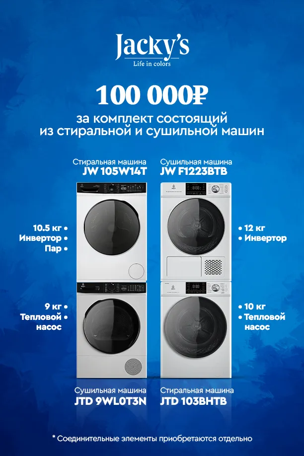 Создайте идеальную прачечную у себя дома! Только с 1 декабря 2025 по 15 января 2026 года Jacky's предлагает эксклюзивные комплекты стиральной и сушильной машин по специальной цене всего 100 000 рублей за пару!