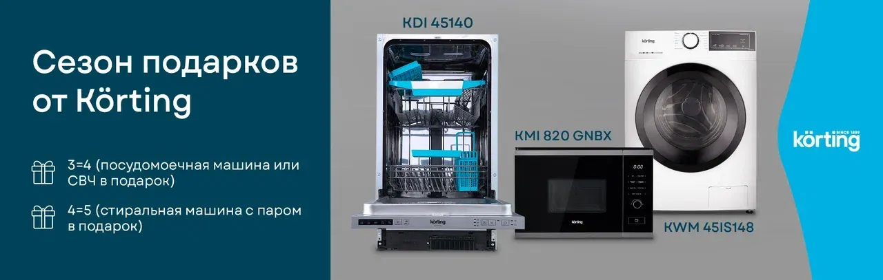 Обновите технику для всего дома с максимальной выгодой! KORTING дарит возможность не просто купить, а получить полноценную технику в подарок. Соберите комплект из 3 или 4 приборов — и выберите свой ценный бонус. Акция действует с 26 декабря 2025 по 31 января 2026 года.