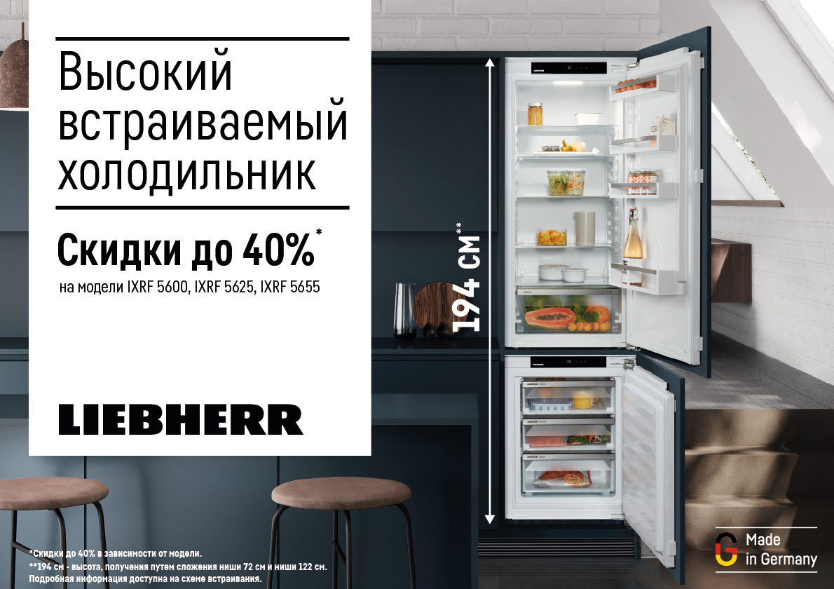 - Высокий встраиваемый холодильник LIEBHERR IXRF 5600 (состоит из встраиваемого холодильника IRe 4100-22 001 и встраиваемой морозильной камеры IFNd 3503-22 001) по уникальной цене: 150 000 руб. вместо 255 000 руб.