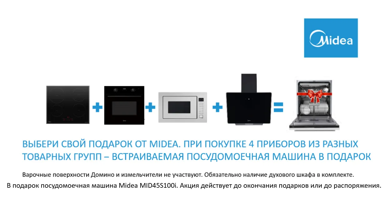 Купите 4 единицы техники Midea – получите ПММ Midea MID45S100i в подарок (пятый прибор в комплекте):