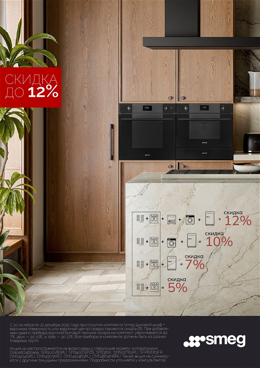 - Духовой шкаф + Варочная Поверхность ( Варочный центр ) + 3 Прибора из другой товарной группы, Вам предоставляется скидка - 12 % на комплект.