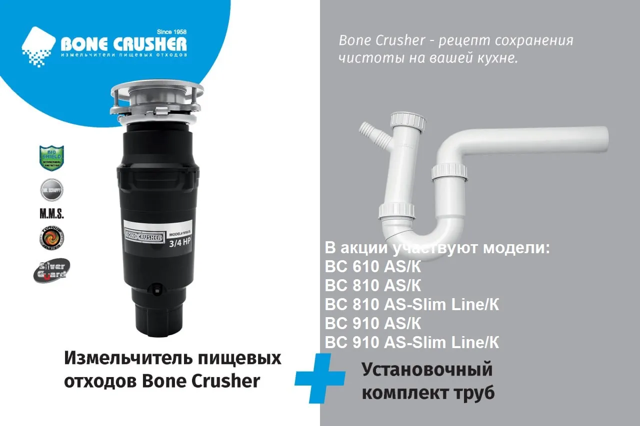 Суть акции: Купите любой участвующий в акции измельчитель Bone Crusher и получите U-образный сифон Bone Crusher 211-AL-LB (D211-Ale) всего за 800 рублей. Это полноценный установочный комплект для быстрого и корректного подключения к канализации.